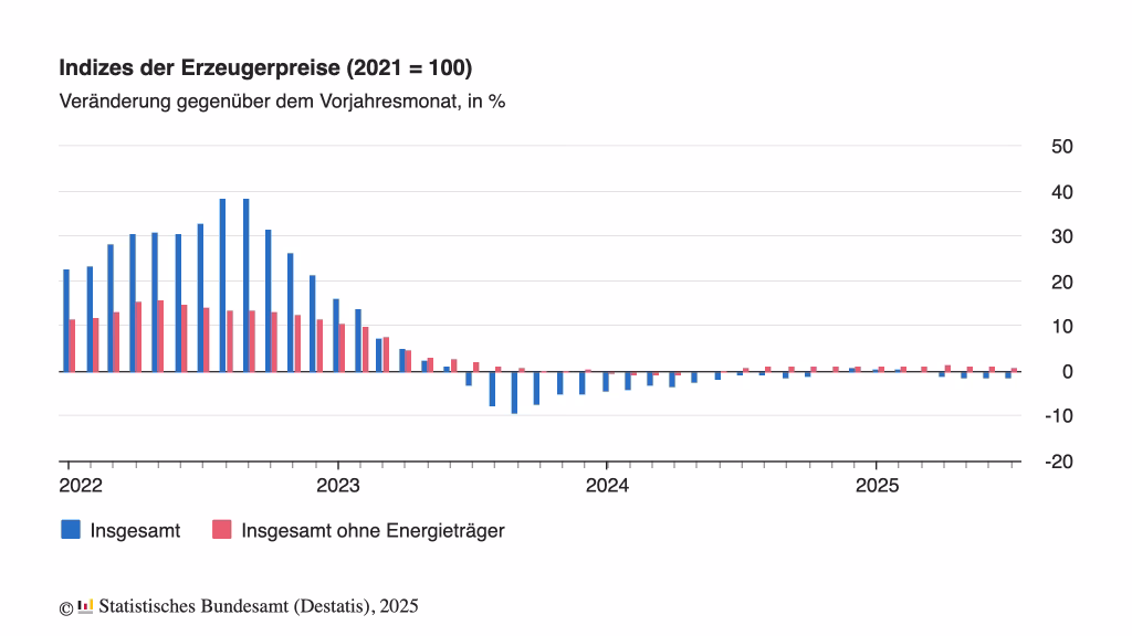 Hauptursächlich für den Rückgang der Erzeugerpreise gegenüber dem Vorjahresmonat waren im Juli 2025 die niedrigeren Energiepreise. Ebenfalls günstiger als vor einem Jahr waren Vorleistungsgüter. Teurer waren hingegen Verbrauchs- und Gebrauchsgüter sowie Investitionsgüter. Ohne Berücksichtigung von Energie stiegen die Erzeugerpreise im Vergleich zum Vorjahresmonat im Juli 2025 um 1,0 %, gegenüber Juni 2025 sanken sie um 0,2 %.